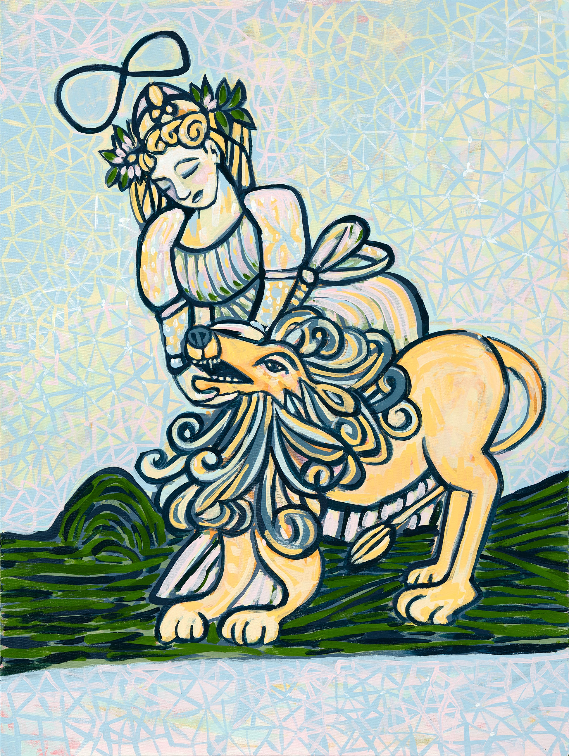 "Strength" from tarot represents grace under pressure, devoted mastery and the power of the will. When I painted her, I tried to include all the energy and joy that this archetype represents. Put her someplace where she can remind you who you are, what you've been through, and what you bring to the table.